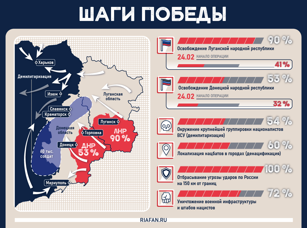 Буквально за неделю Вооруженным Силам РФ, а также армейским подразделениям Донецкой и Луганской народных республик удалось добиться значительного продвижения по территории Украины, освободить несколько крупных населенных пунктов, блокировать силы ВСУ и нацистских формирований вокруг основных центров и локализовать угрозу прорыва украинской армии. Все развитие операции основано на стремлении сохранить жизни мирного населения и избежать ненужных разрушений.